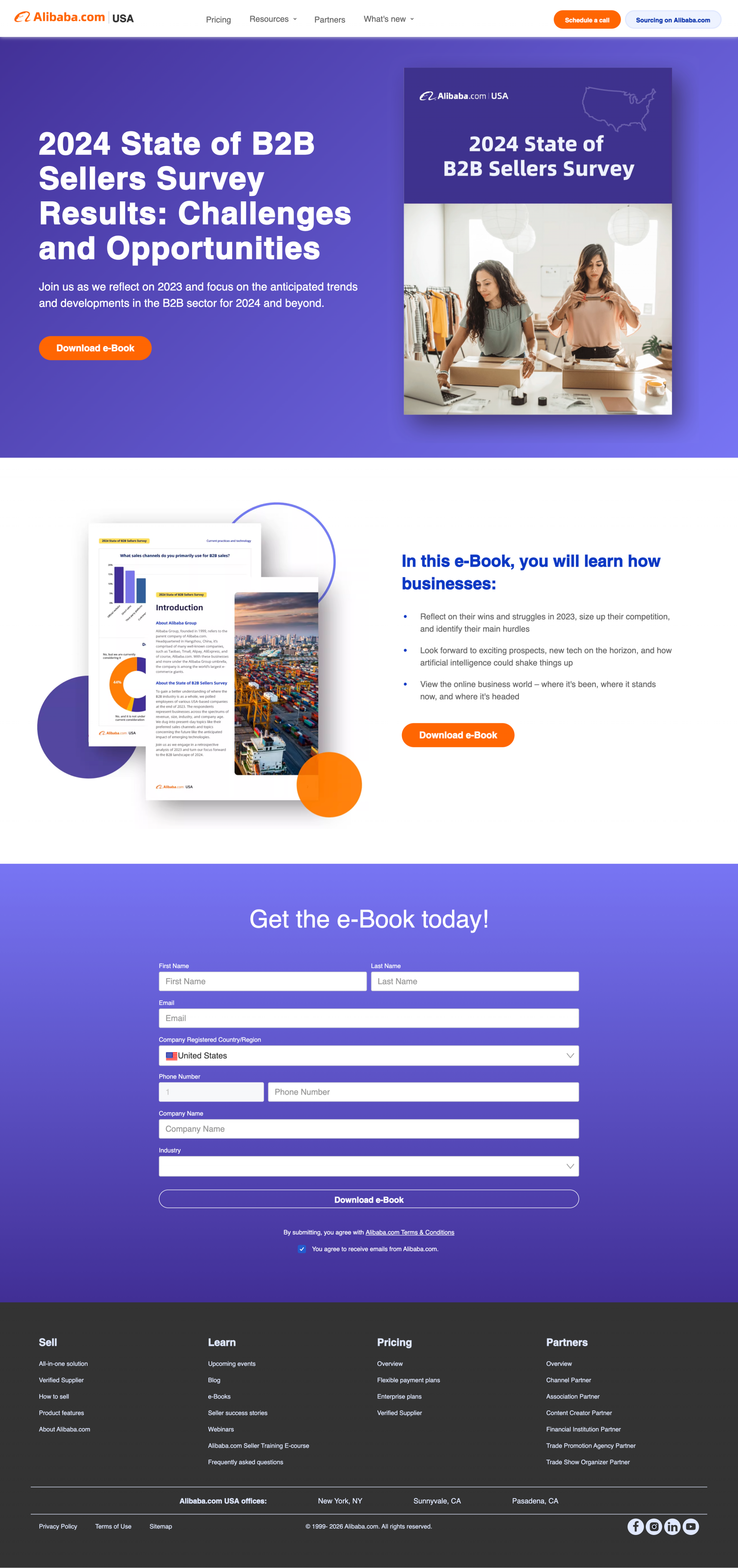 B2B sellers are harder to reach than B2C audiences, and even harder to convert in a single interaction. Alibaba.com needed a way to provide genuine value to US business owners before asking anything in return. A research-backed survey report gave the team a reason for businesses to engage with the brand, while a gated landing page turned that interest into a qualified lead pipeline.