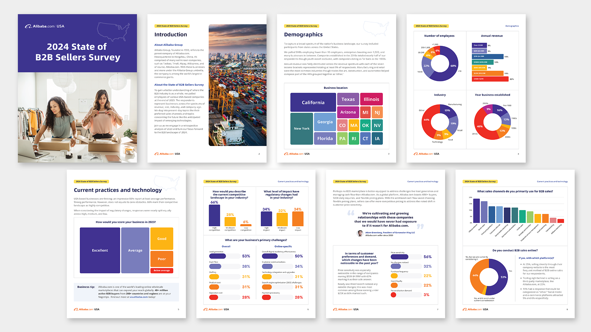 At the end of 2023, Alibaba.com surveyed US-based businesses to understand the current state of B2B commerce and what sellers were expecting in the year ahead. The research covered companies across industries, revenue sizes, and business ages, from startups founded in the 2010s to companies dating back to the 1800s. I designed the ebook and landing page to turn those survey findings into a lead generation campaign, with the report gated behind a form submission. The campaign was promoted through social media and email to reach B2B sellers across the country.