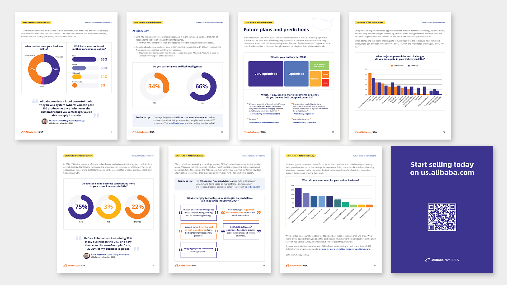 The ebook was built around the survey findings, covering US B2B sellers’ preferred sales channels, industry trends, and their expectations around emerging technologies heading into 2024. The content strategist conducted the original survey and produced a draft for social infographics. I wrote the full ebook based on that research, structured the narrative from retrospective analysis of 2023 into a forward-looking view of the B2B landscape, and designed the 16-page report. The visual style needed to be eye-catching enough to work as social content while staying consistent with the Alibaba.com brand and appropriate for a B2B audience.