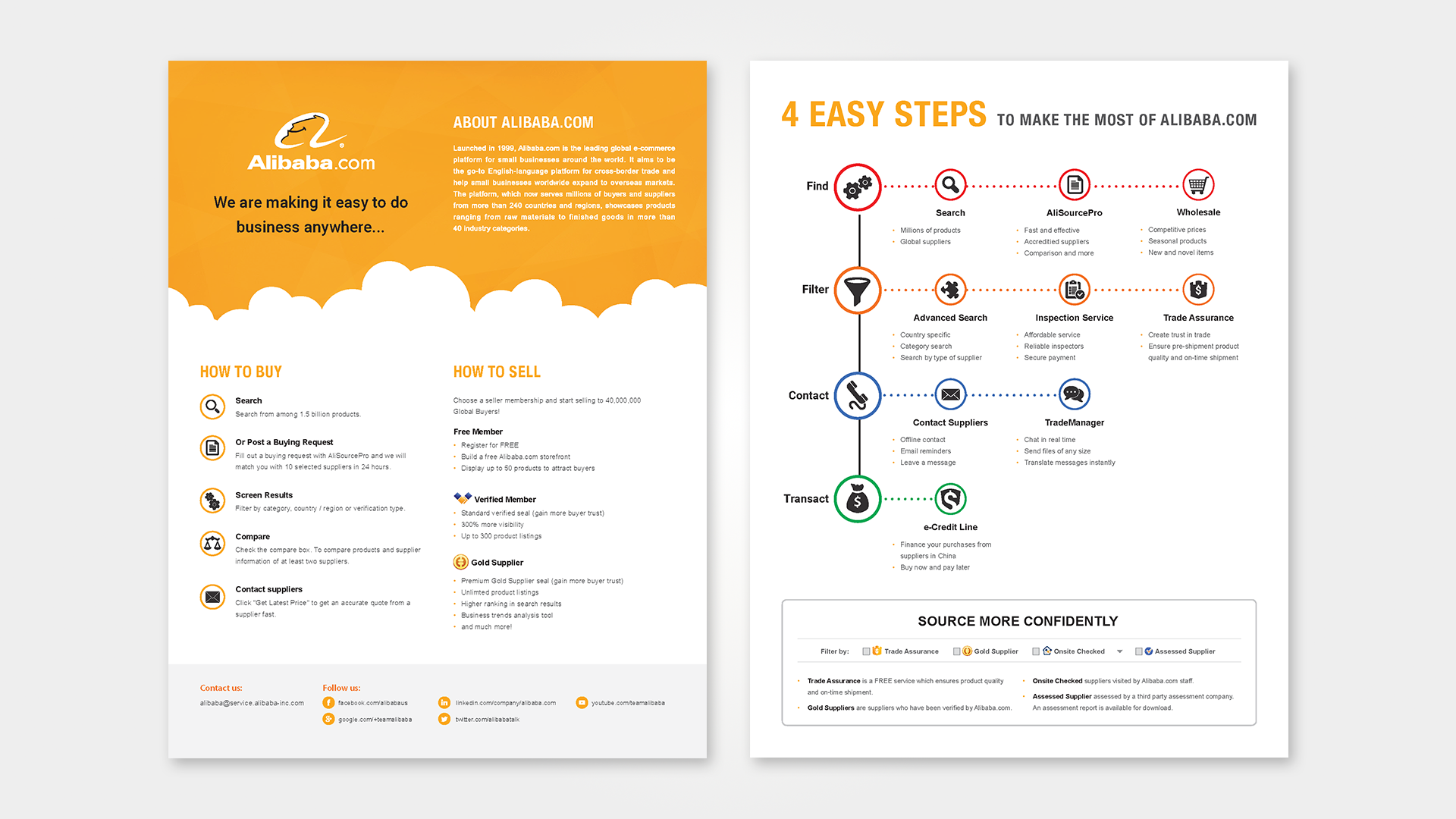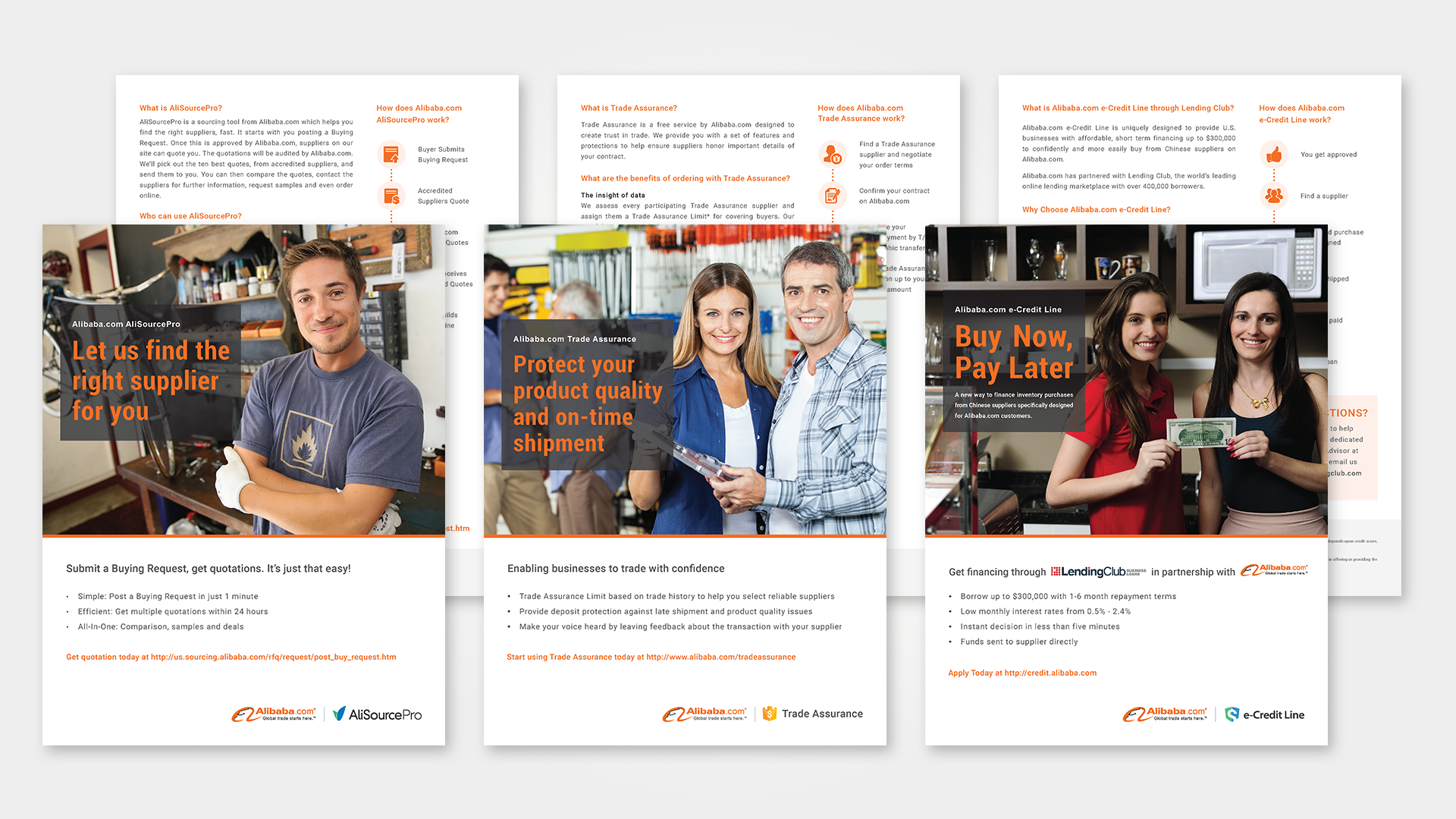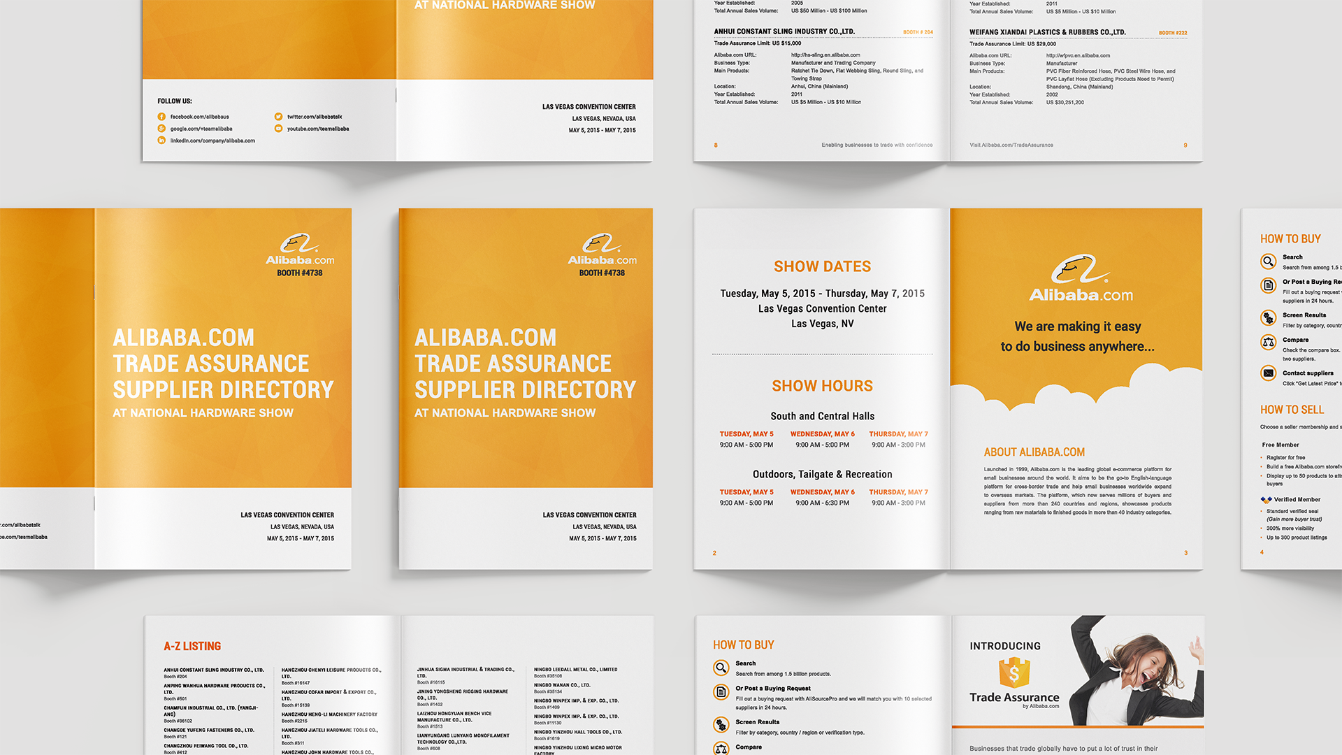 With Trade Assurance suppliers attending the show, the printed materials needed to work for two audiences. Some visitors were encountering Alibaba.com for the first time, while others were ready to connect with specific suppliers on the floor. To support visitors at different stages, I designed four service flyers and five sourcing and trading articles they could take with them. For buyers ready to do business, I designed a 48-page Trade Assurance Supplier Directory listing every Alibaba.com seller attending the show who accepted Trade Assurance. Each entry included the supplier’s booth number, storefront URL, Trade Assurance limit, business type, main products, location, year established, and annual sales volume, giving buyers everything they needed to make confident purchasing decisions knowing their orders were covered.
