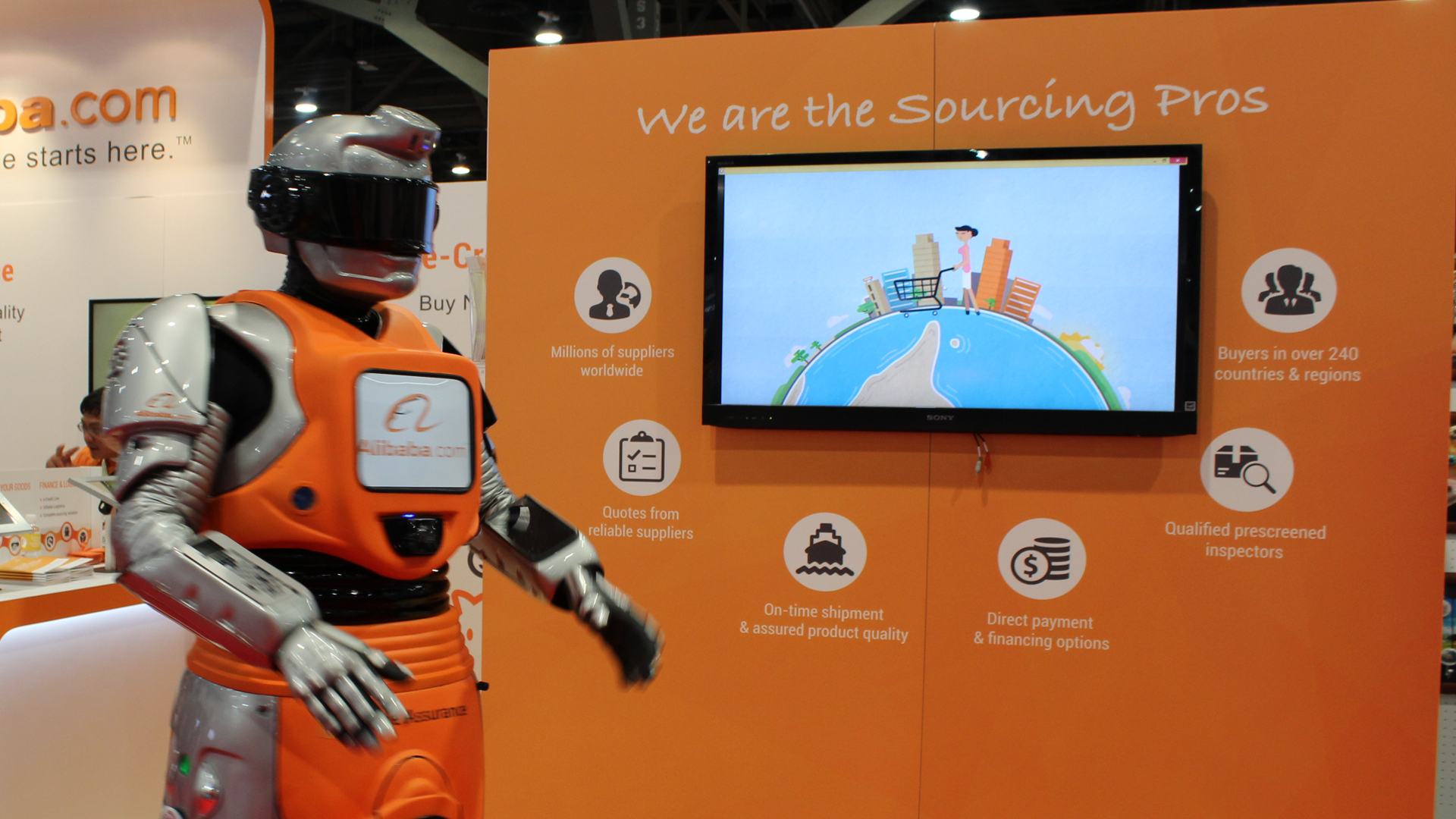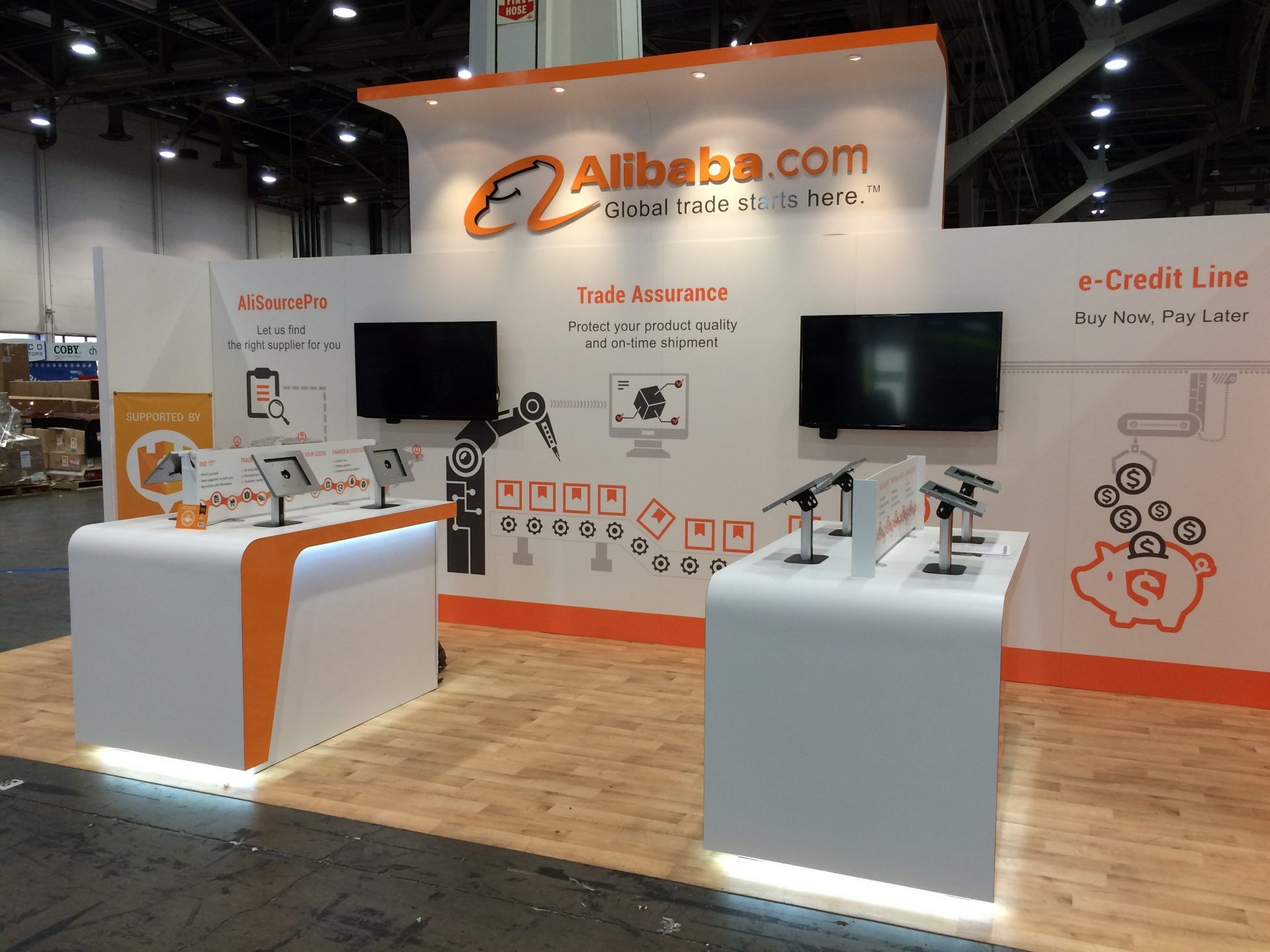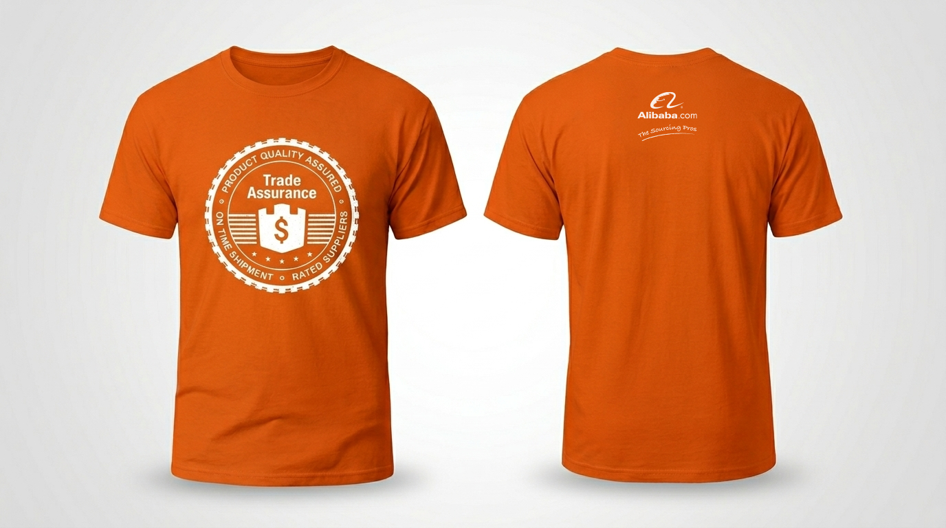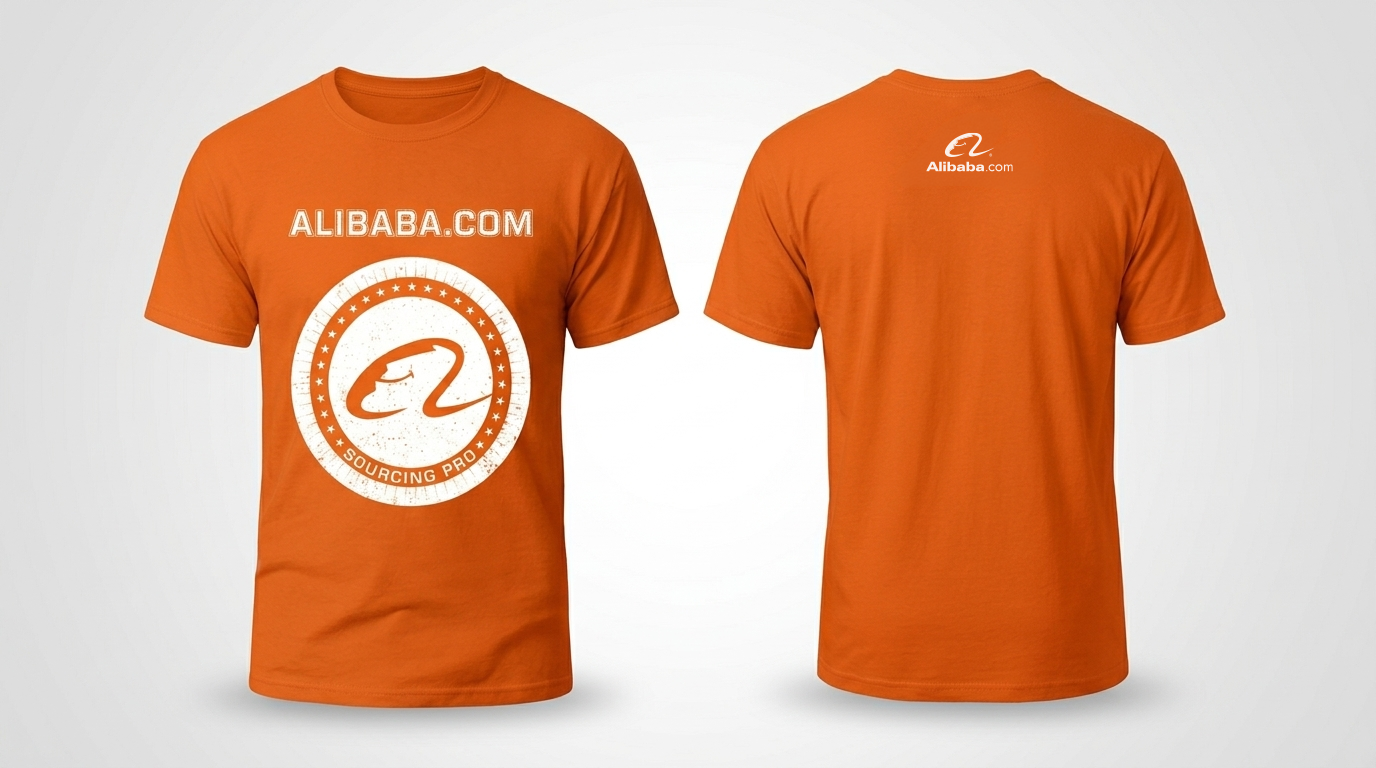 The show theme was “The Sourcing Pros,” positioning the Alibaba.com team as experts who could help visitors learn how to source smarter. The theme carried through everything, from the booth graphics to the staff t-shirts I designed. Every team member on the floor wore the same Sourcing Pros shirt, featuring hardware-inspired elements like gears and production lines as a nod to the show’s audience, keeping the brand consistent from the booth wall to the people representing it. The visual focus centered on three Alibaba.com service products, including AliSourcePro, Trade Assurance, and e-Credit Line. I created three custom illustrations to communicate each product’s value at a glance, without relying on dense copy, anchoring them on the main booth wall to set the visual tone for the whole space.