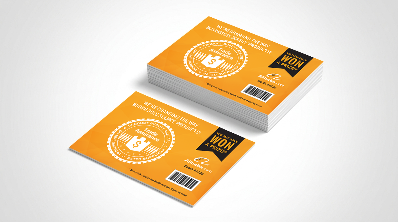 Every giveaway at the show was designed to carry the Trade Assurance message, not just the logo. I redesigned the tote bag with updated messaging promoting Trade Assurance, and designed the t-shirt prize tied to a postcard QR code game run at the booth. Even the branded water bottles reinforced the same message. When every item someone picks up is saying the same thing, the brand story travels with them past the show floor.