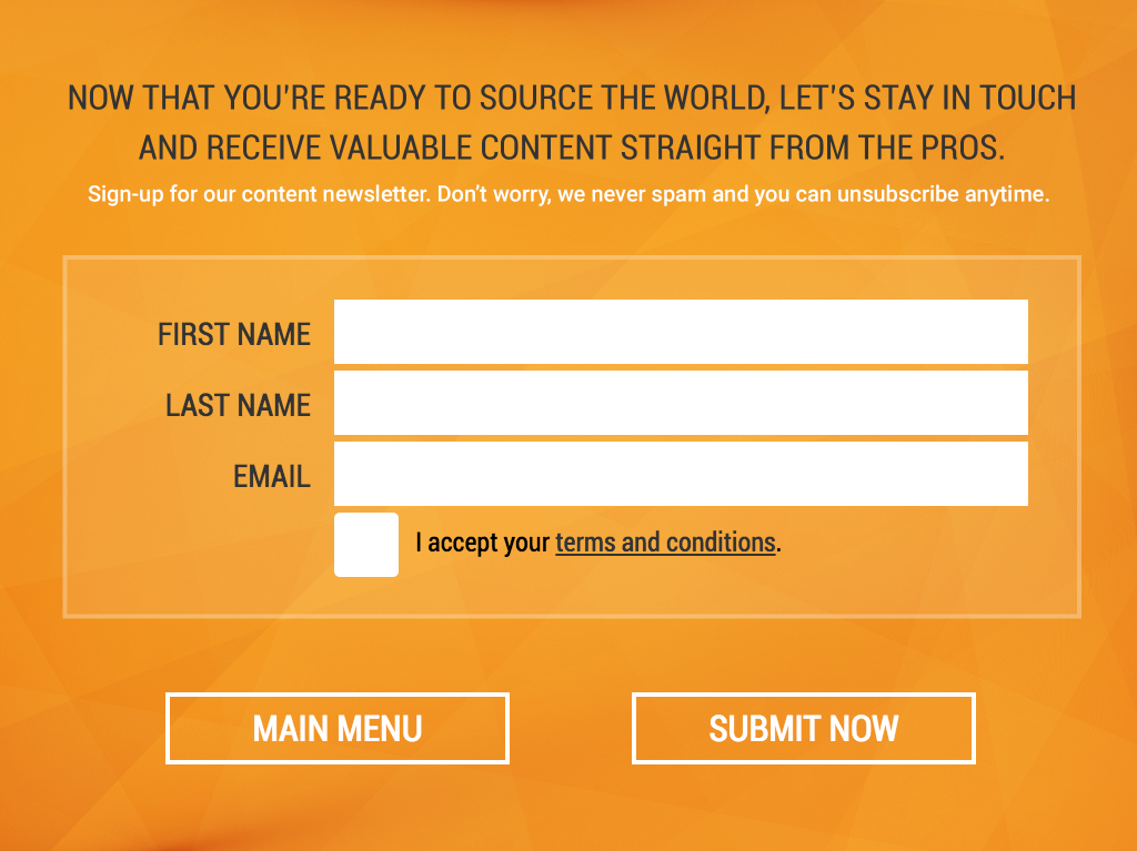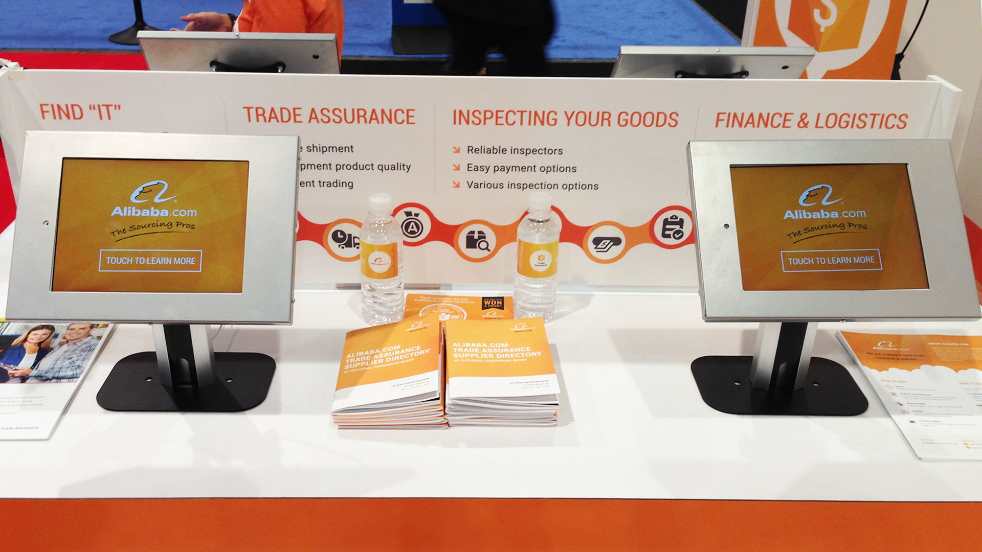 Instead of running traditional product demos, I replaced the standard demo stations with a custom interactive kiosk experience across 8 iPads. I researched and selected a customizable app platform that could be built with HTML and CSS, handled the full interface design, then developed, installed, and QA’d every device before the show opened. On the floor, I managed the stations and handled any troubleshooting as issues came up live. Visitors could watch five short videos about Alibaba.com and its services, subscribe to the newsletter, and complete a short survey, giving our team a direct lead capture channel built into the booth experience. Of the 2000+ leads collected over the three-day show, the kiosk stations were a primary driver.