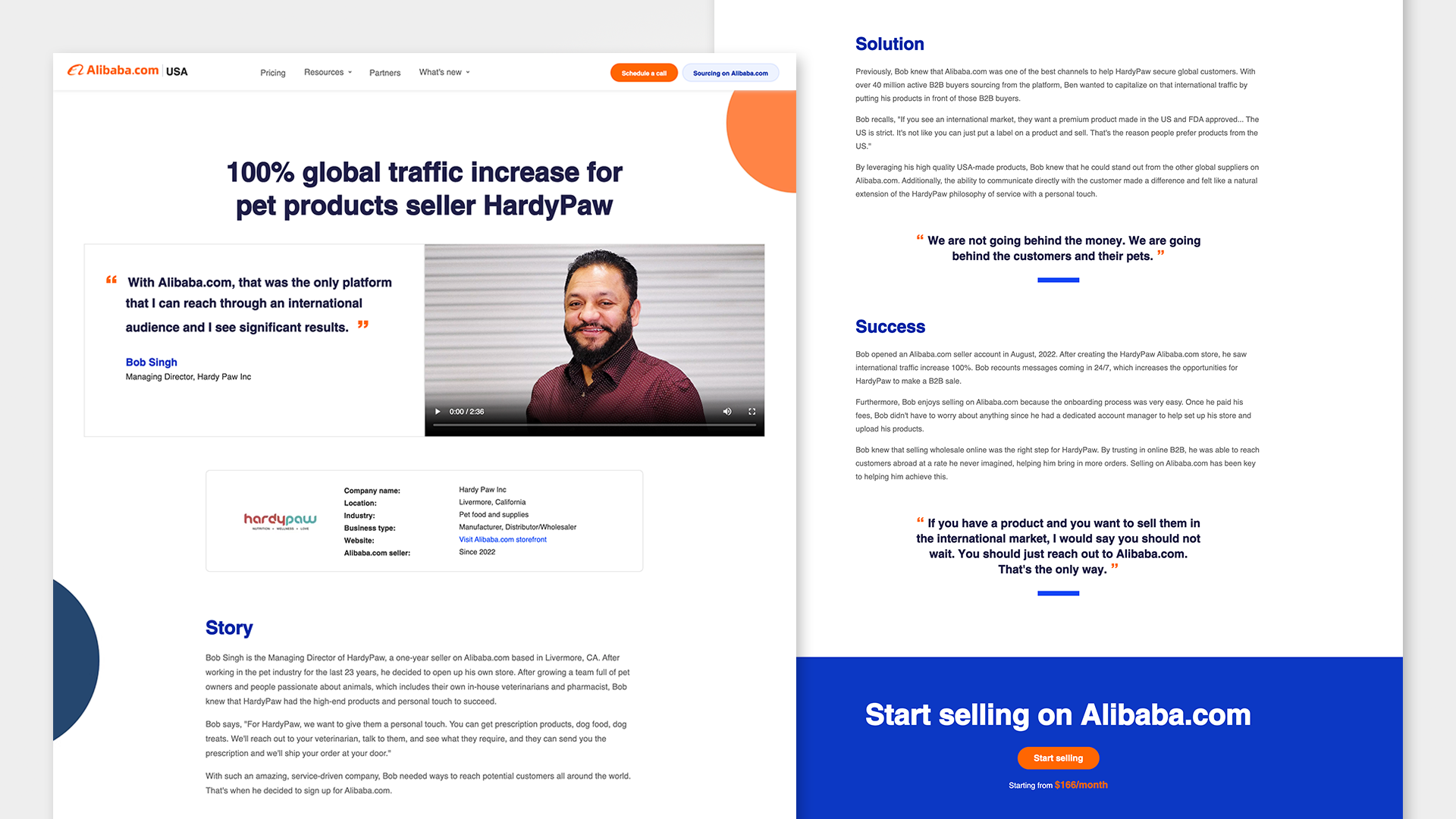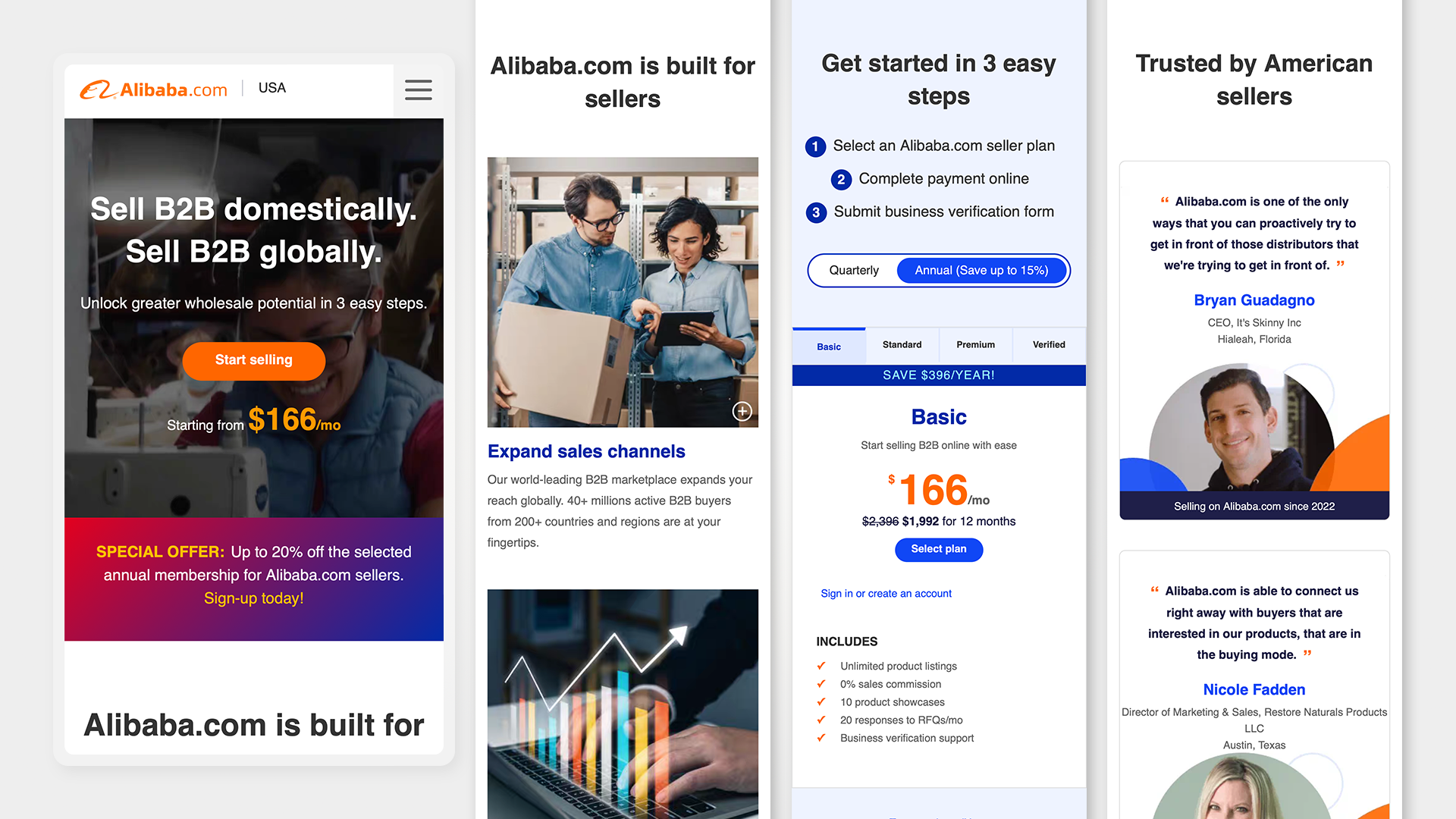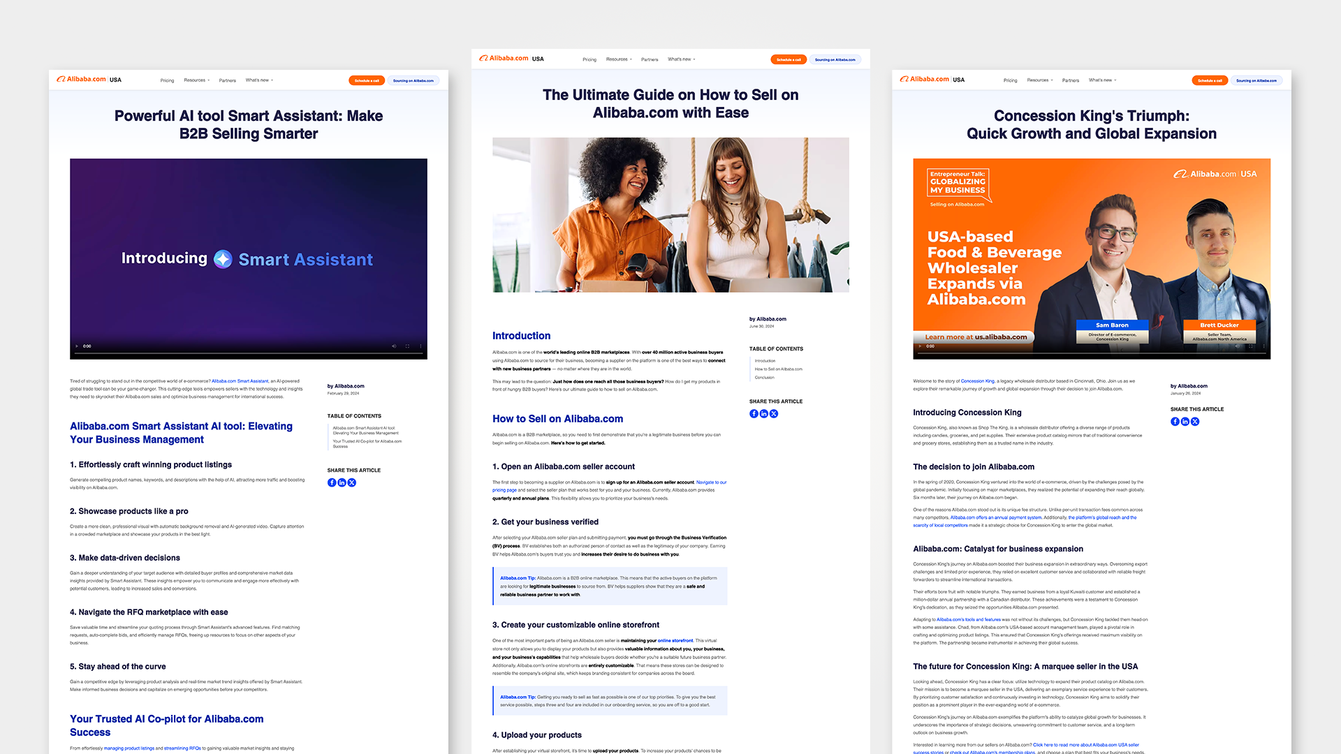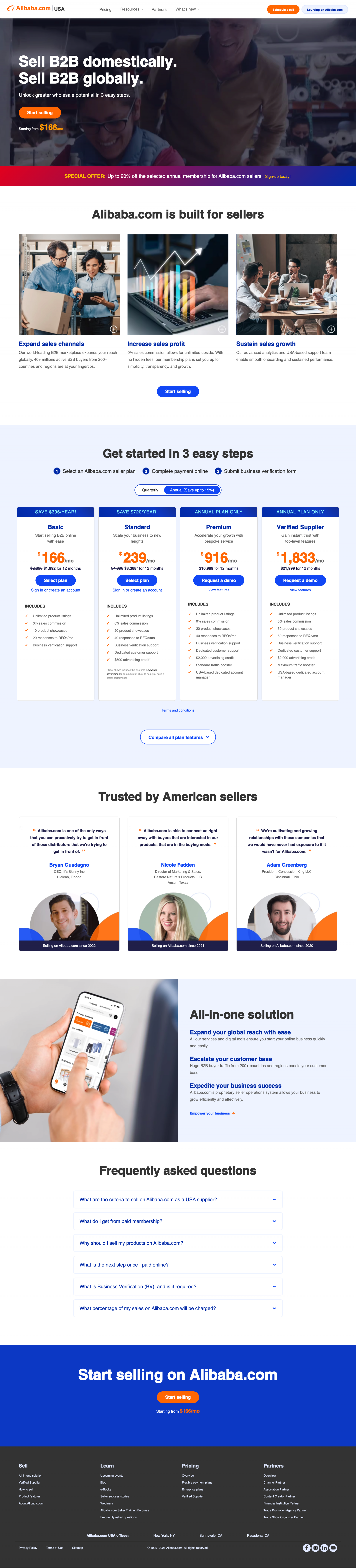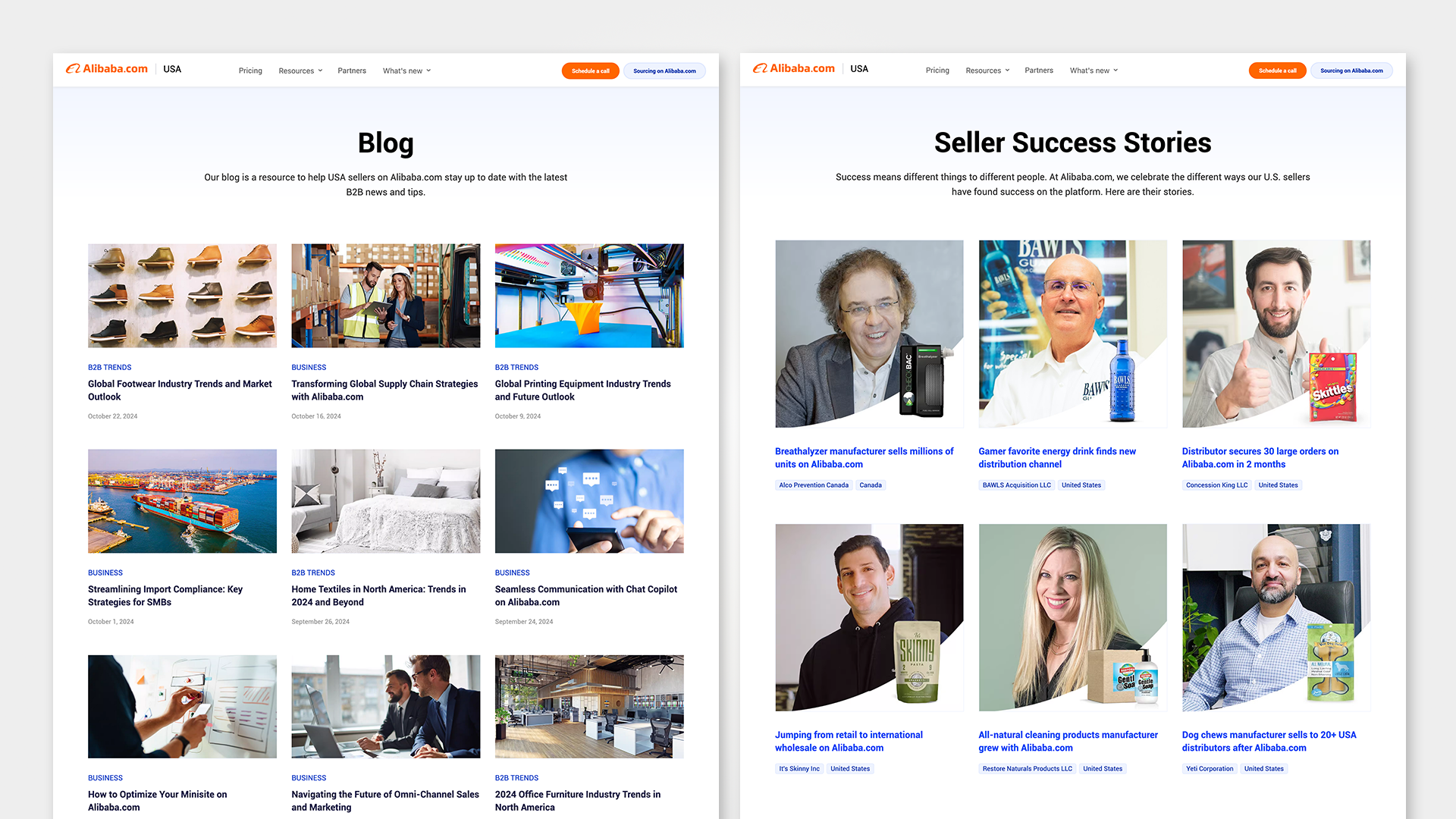 The Alibaba.com USA website is the primary seller acquisition platform for the US market, designed to introduce the platform to American businesses and convert visitors into sellers on Alibaba.com. I owned the project end to end, from initial wireframing and design through front-end development, launch, and ongoing optimization. The site officially launched in March 2023 with a call-scheduling flow and evolved into a full self-serve membership purchase experience as the business grew. At over 100 pages, the site covers pricing, resources, blog content, seller stories, partner pages, events, and training materials, all built and maintained as a living platform rather than a one-time launch.