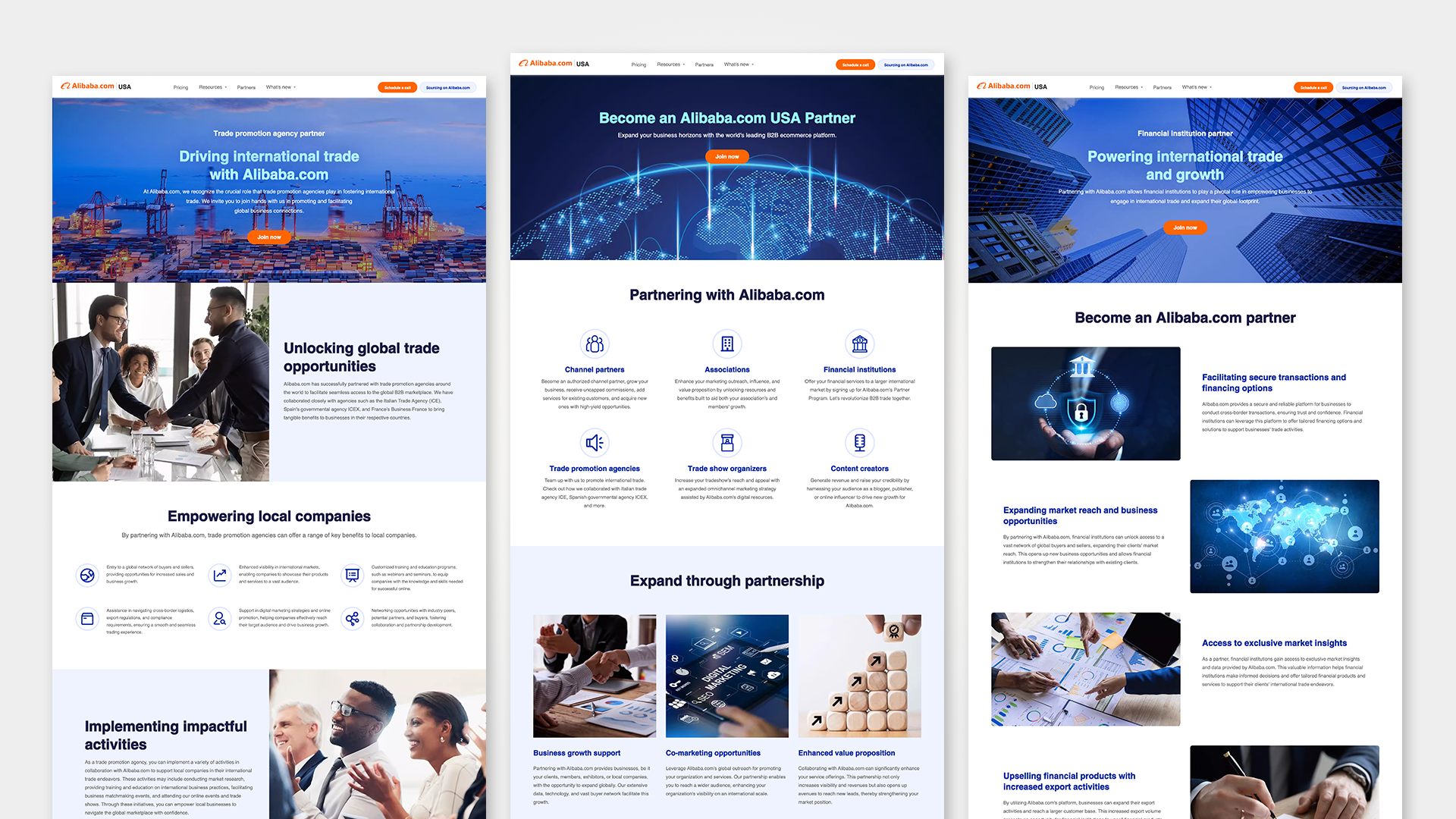 The Partners section introduced businesses that had joined Alibaba.com’s partner network, including six partnership categories and seven individual partner pages. Each partner page was designed to highlight the partnership value and drive co-branded traffic back to the main site.