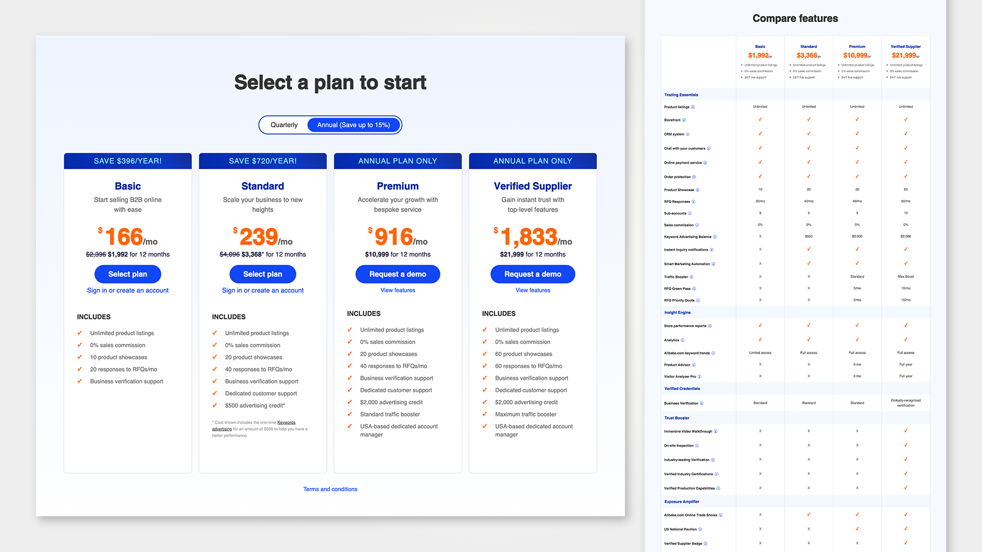 The pricing page is where visitor intent converts into action, making it the most performance-sensitive page on the site. The user flow from plan selection through account creation or login to payment was redesigned multiple times to reduce drop-off at each step. Every additional click or screen is a chance for a user to leave, so the flow needed to be as short and clear as possible. The pricing structure itself also evolved as Alibaba.com shifted from a call-scheduling model to a self-serve online purchase flow, requiring the page design to adapt around new business requirements while maintaining conversion performance.